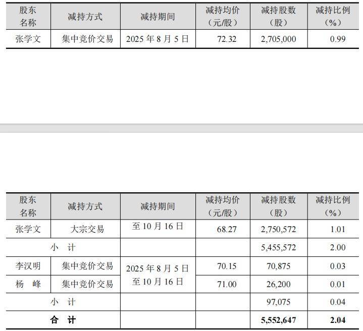 公司于近日收到持股5%以上股东张学文出具的《减持股份计划实施完毕的告知函》,自前次集中竞价减持股份550,200股,张学文及其一致行动人持股比例由63.08%下降至62.88%触及1%刻度后(具体内容详见公司于2025年8月7日披露的《关于持股5%以上股东减持股份触及1%刻度的公告》)。张学文再次集中竞价减持公司股份2,154,800股,大宗交易减持公司股份2,750,572股。2025年8月5日至10月16日,张学文累计减持公司股份5,455,572股。减持后,张学文及其一致行动人合计持有公司股份166,619,367股,持股比例为61.08%,其减持计划已完成。
