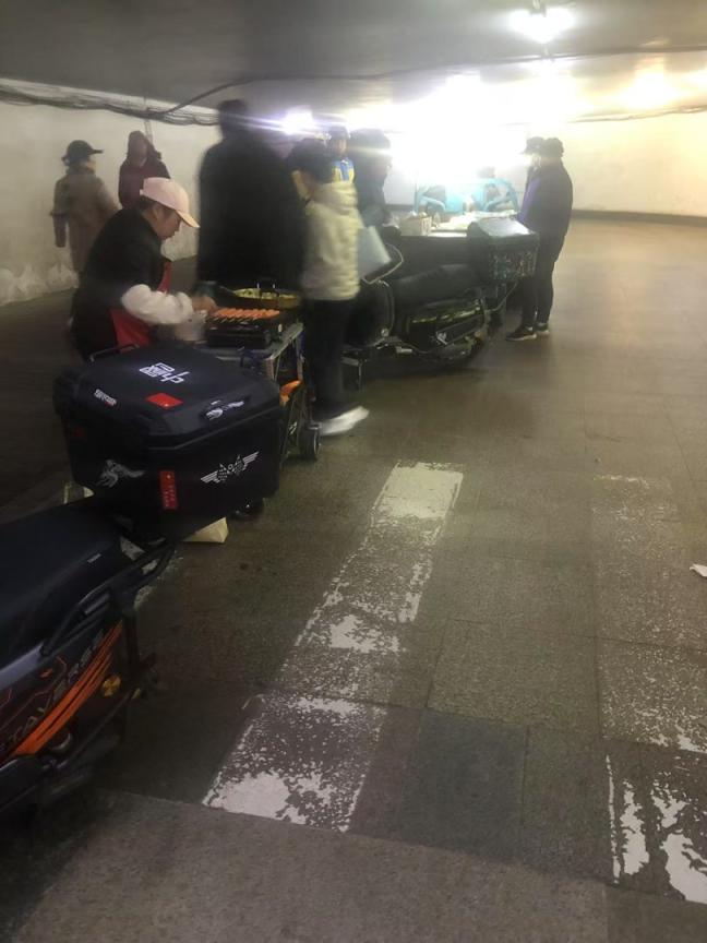 白石新桥过街通道四通八达,毗邻公园、体育场馆、写字楼,平日过往人员、车辆很密集,尤其在早晚高峰时段,通道里通勤的市民更多。对于商贩来说,密集的人流、车流里蕴藏着“商机”。与街头相比,在过街通道内经营也更隐蔽,同时还不受雨雪天气的影响。