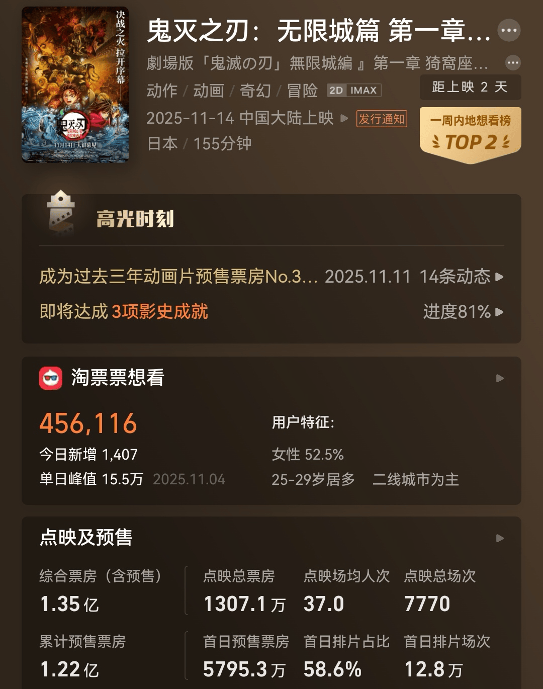 偏冷的十一月影市终于迎来强片,截止11月12日早7:30,将于11月14日正式上映的日本进口动画电影《鬼灭之刃:无限城篇 第一章》累计预售票房达到了1.35亿元,创下进口动画最高预售纪录。