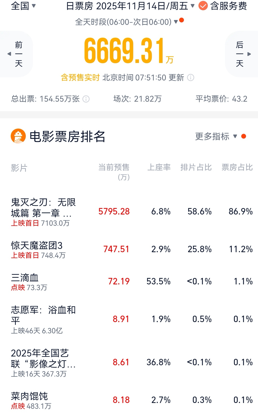 11月14日还有一部好莱坞进口片《惊天魔盗团3》上映,该片首日预售750万元,累计预售票房约1300万元。