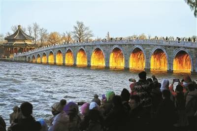 昨日,数百名游客、摄影爱好者在颐和园十七孔桥附近拍摄“金光穿洞”奇景。当日16时许,夕阳以低角度斜穿十七孔桥桥洞,金色光柱将石拱内壁染成暖黄,与昆明湖的冷冽水波形成鲜明对比。